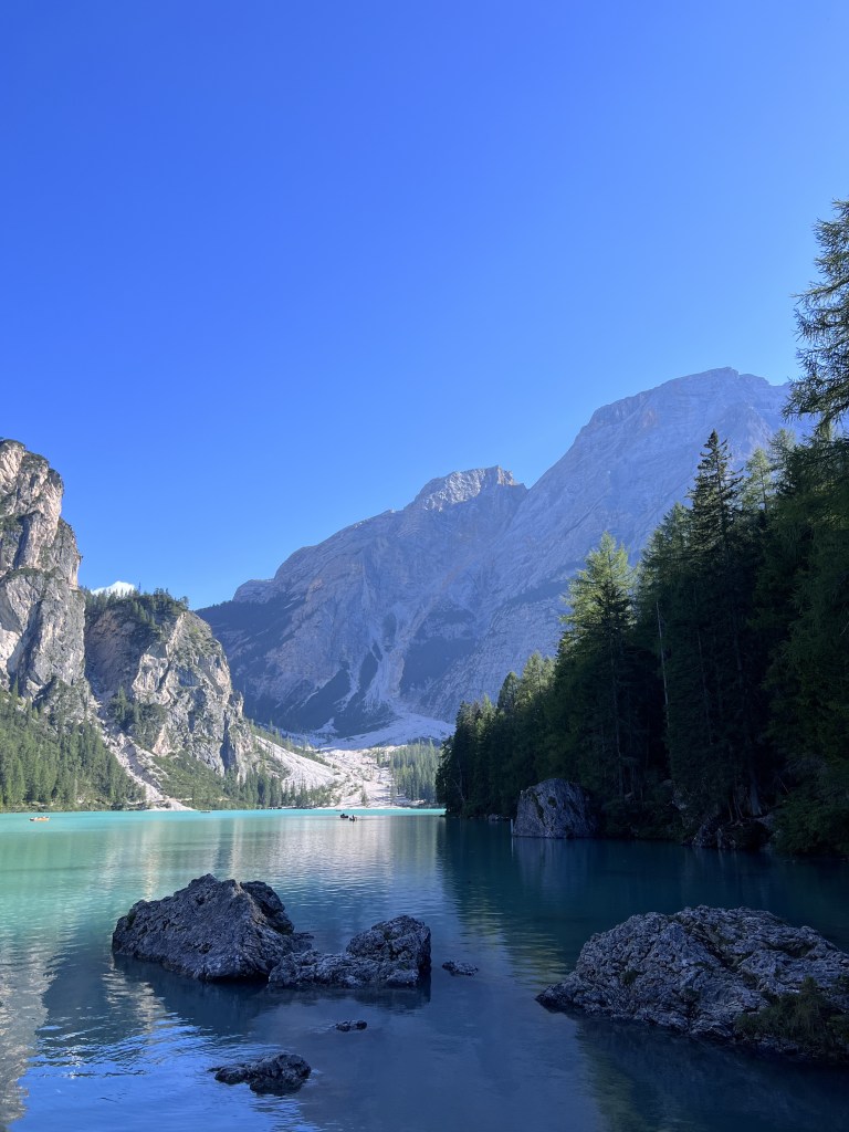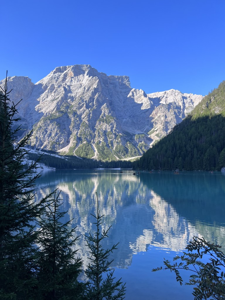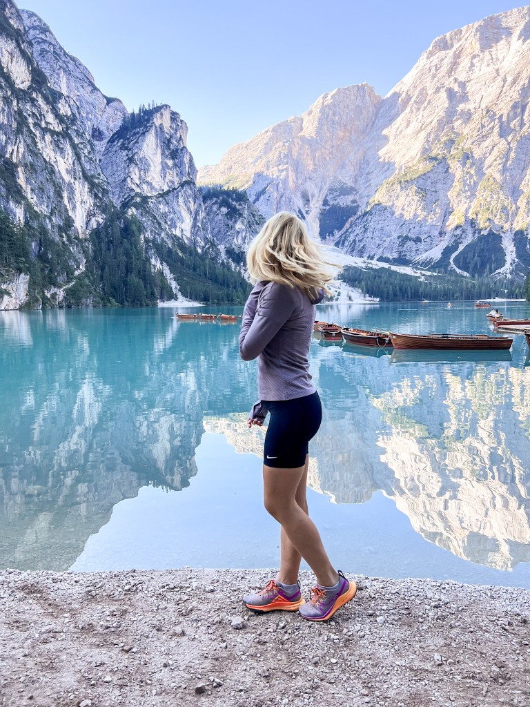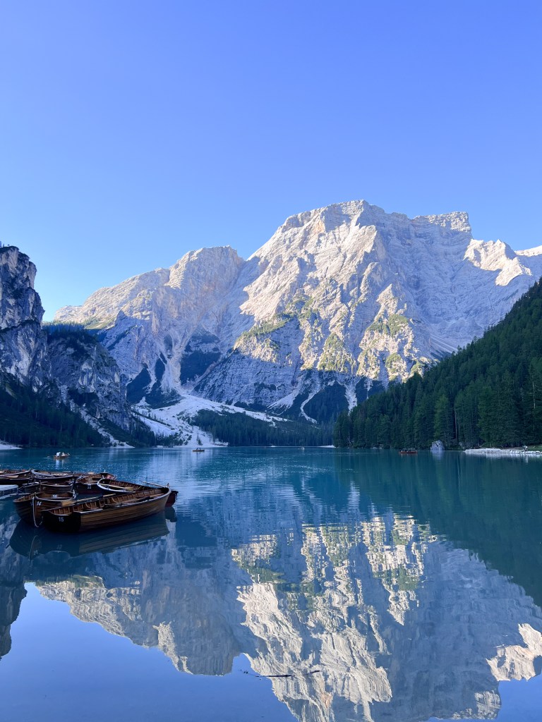 On our first day we visited Lago di Braies, also known as Pragser Wildsee, a mesmerizing alpine lake nested in the heart of the Dolomites in northern Italy. This place was on my must-see destinations list with it’s crystal-clear, emerald-green waters that reflect the towering peaks of the surrounding mountains, creating a picture-perfect setting. Everything looked like a fairytale to me.
