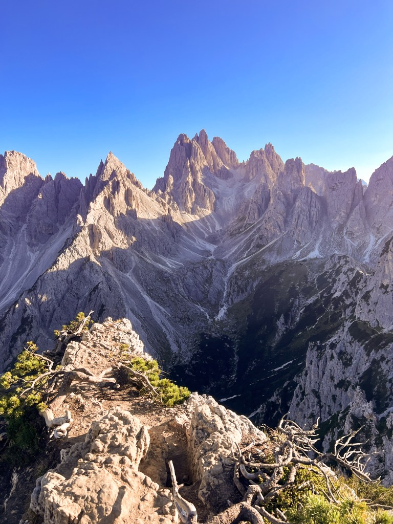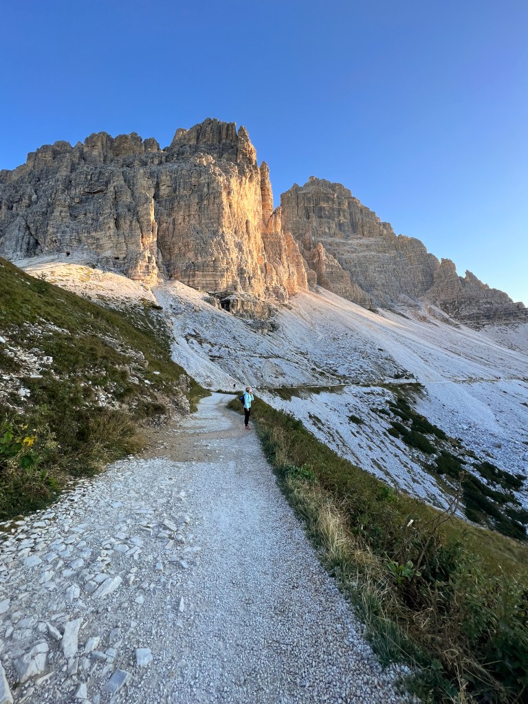 With this on our minds, we started our hike at 7 am. Undeniably, the colors were amazing, like an early golden hour. The circuit trail around the Tre Cime is around 9 kilometers, but we did a little extension (trail number 104) to Rifugio Zsigmondy-Comici. This route offered a less crowded hiking experience, with amazing landscapes. From there we circled back to the circuit trail and stopped for a well-deserved lunch at Dreizinnenhütte. Seated on the terrace, we ate our Apfelstrudel, accompanied by a cup of coffee, and wondered how insanely unique these peaks are.