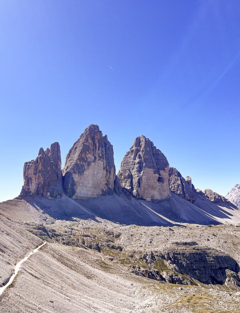 The second day, we headed to Tre Cime De Lavaredo (also known as Drei Zinnen), one of the most popular and iconic mountain formations in the Dolomites. Tre Cime di Lavaredo is one of the most visited destinations for outdoor enthusiasts. A well-maintained trail, “Circuito delle Tre Cime” (“Drei Zinnen Rundweg”) encircles the base of the peaks, offering stunning panoramic views of the three peaks and the surrounding landscapes.