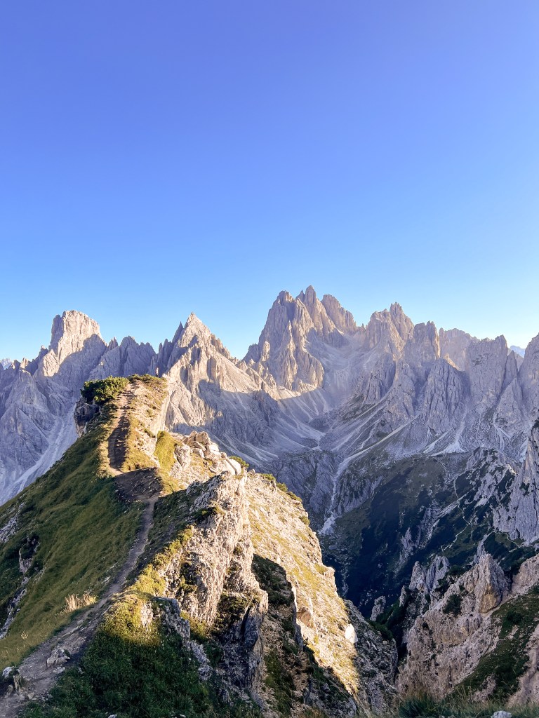 The trail to the Misurina viewpoint also starts from Refugio Auronzo (although an alternative route begins at Misurina Lake). We opted for this quick hike on the same day, being only a round trip of less than 4km. Reaching the viewpoint in the late afternoon, the changing lights heightened the beauty of the surrounding mountains. Accessible via a narrow path, the viewpoint offers an spectacular panorama of the nearby peaks, so it’s absolutely worth the hype.