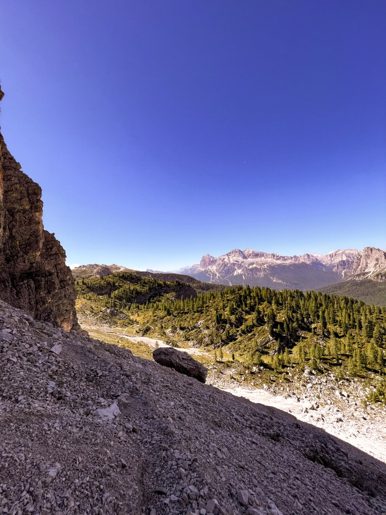 On our return journey, we opted for a more challenging yet exceptionally scenic trail (trail number 216). Along the way, we stumbled upon a perfect spot to pause for lunch, offering a panoramic view of Tre Cime de Lavaredo and lake Misurina.