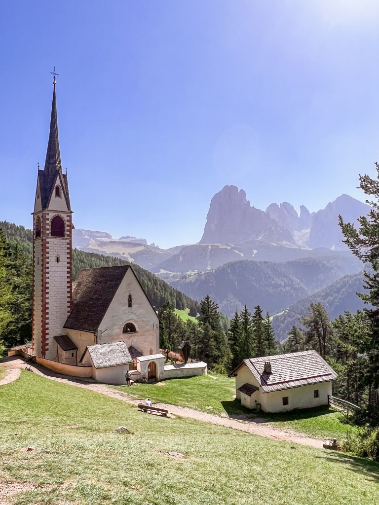 After the challenging hike in Seceda, we decided to take a day off, wander around in Val Gardena, and visit the charming town Ortisei. Ortisei is easily accessible by road and public transportation, making it a convenient base for exploring the Val Gardena region. It is well-connected to neighboring towns and attractions. Strolling through the center and shopping for Limoncello and other goods, we found a short hike (rather a walk) to St.-Jakobs-Kirche, the oldest church in Val Gardena. First written documents date back to August 18, 1283.