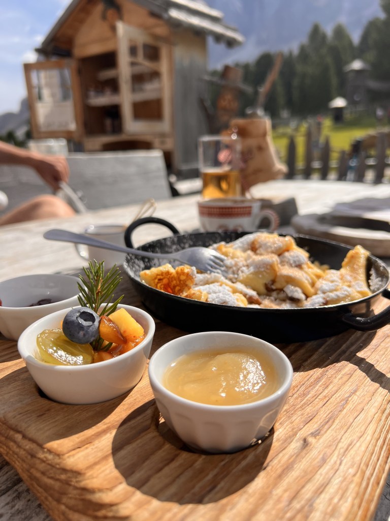 Along some of the trails, you’ll find mountain huts where you can savor local cuisine and refreshments. These huts offer a welcoming break during your exploration. We also stopped at one of the huts for a well deserved Kaiserschmarrn (traditional Austrian desert) with a nice cup of coffee. This is what I call coffee with a view.