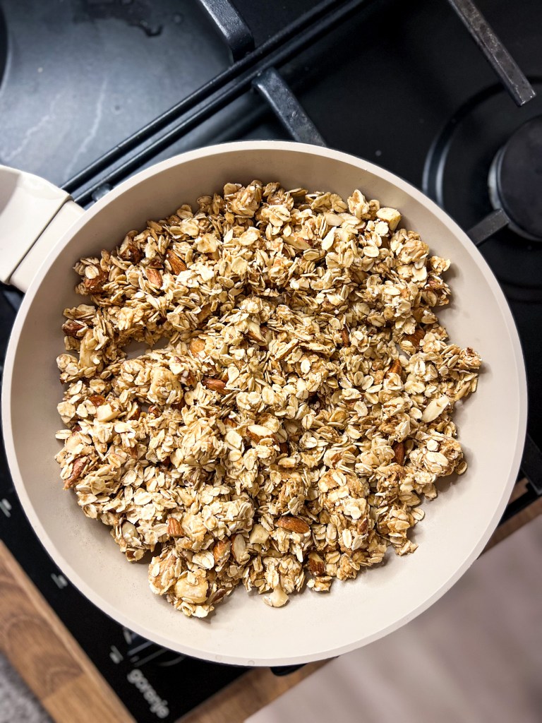 - Spread the mixture evenly on the baking sheet. Bake for 20–25 minutes, stirring halfway through, until it’s golden and toasty.