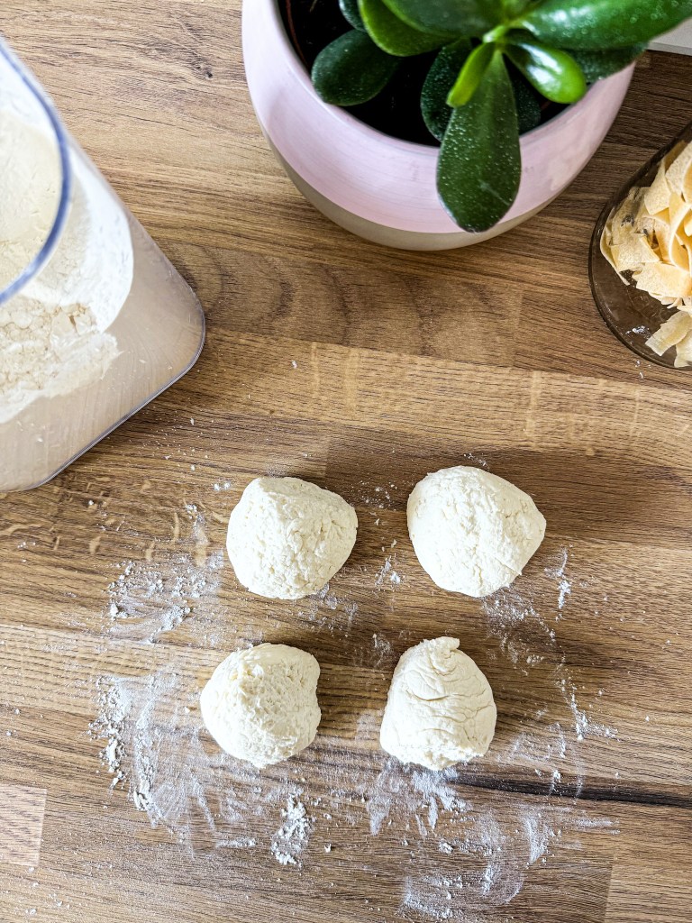 - Lightly flour your surface and knead the dough for about 2 minutes until smooth. Divide into 4 equal portions and shape each piece into a bagel.