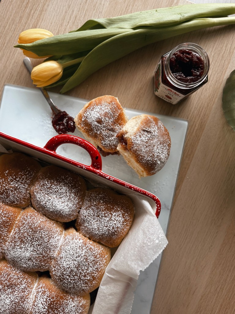 There’s something deeply comforting about baking in a lazy, no-rush Sunday. The quiet moment when the dough begins to rise, the familiar scent of warm milk and sugar, and the promise of something golden waiting in the oven—it all slows time down just enough. These jam pull-apart buns are the kind of treat that belong in a calm afternoon, when the kitchen is warm and there’s no rush to be anywhere else.