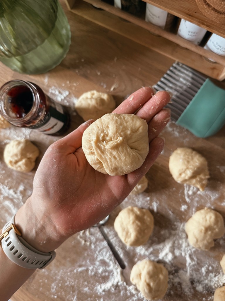 - Shape the buns: turn the dough out onto a lightly floured surface and divide it into 16 equal pieces. Roll each piece into a ball, cover, and let them rest for 10 minutes.