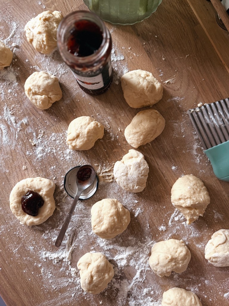 - Fill and assemble: gently flatten each dough ball, place 1 teaspoon of jam in the center, pinch the edges closed, and reshape into a smooth ball. Arrange them seam-side down in the baking dish, leaving about 1 cm space between each.